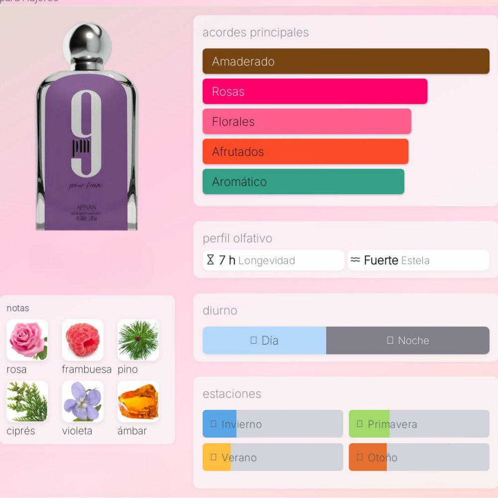 Una fragancia vibrante y sofisticada, diseñada para realzar la feminidad con un toque moderno y elegante. 9 PM Pour Femme abre con una explosión de frutos rojos mezclados con matices cítricos, evoluciona hacia un corazón floral refinado y se asienta en un fondo cálido de maderas y ámbar que deja una estela memorable.