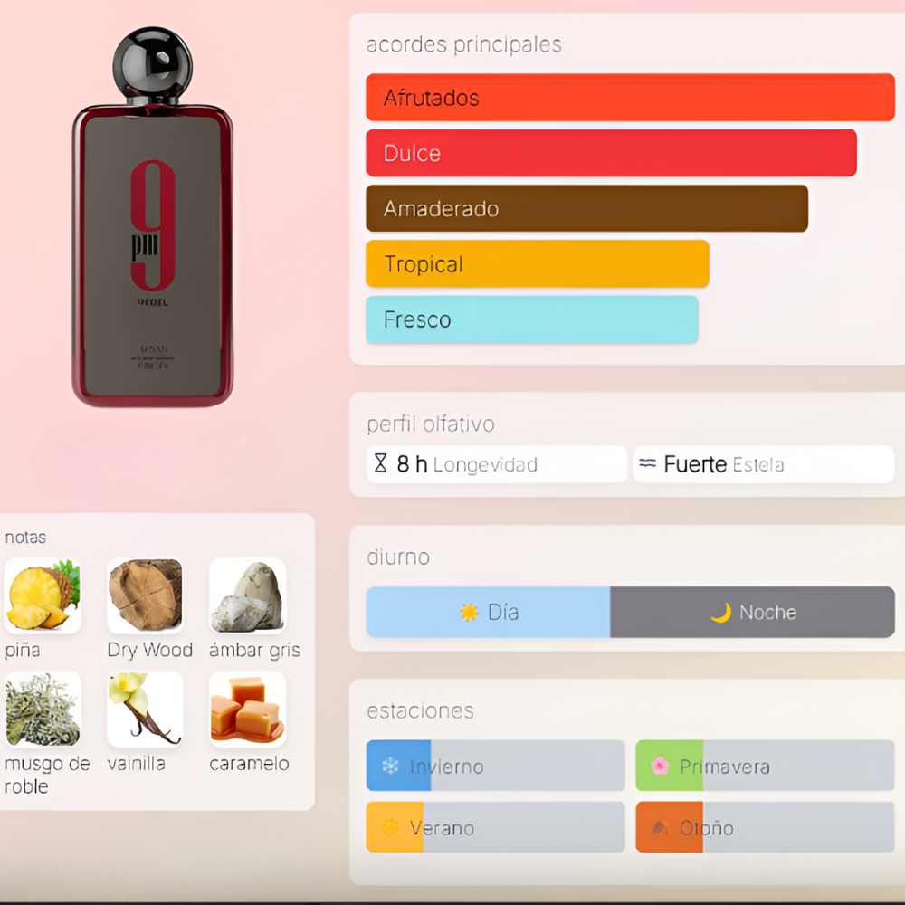 Una fragancia audaz y moderna que rompe esquemas: 9 PM Rebel combina una apertura explosiva de frutas tropicales con un corazón amaderado y un fondo seductor de caramelo y ámbar, creando una presencia intensa y envolvente. Ideal para quien busca destacar con carácter, sin seguir reglas.