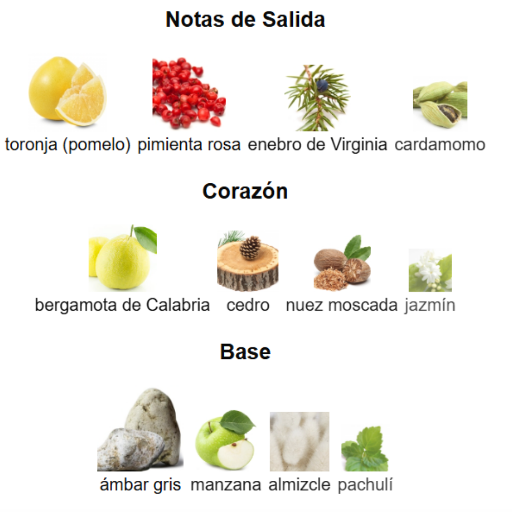 Corazón: bergamota de Calabria, cedro, nuez moscada y jazmín