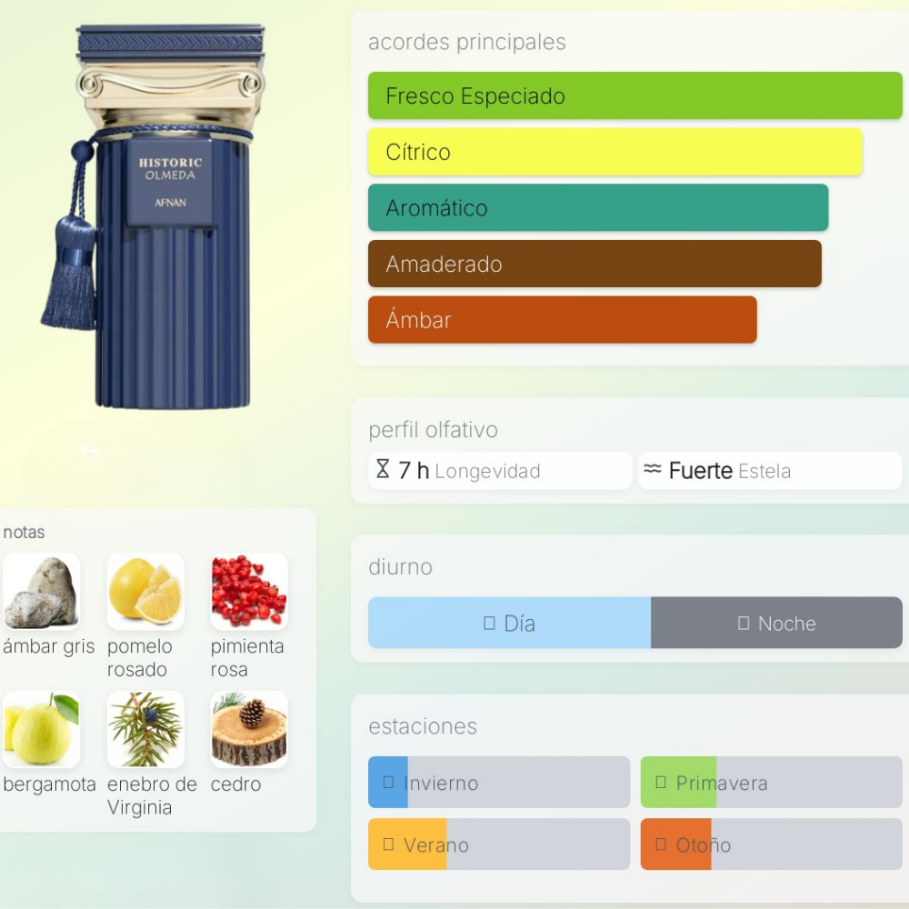 Una fragancia fresca y sofisticada que conjuga la vitalidad de los cítricos y especias con un fondo elegante de maderas y almizcle. Historic Olmeda es ideal para quienes buscan un aroma con carácter moderno, versátil, que funcione tanto de día como de noche y que deje una estela distintiva.