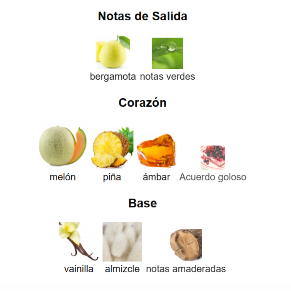 Corazón: melón, piña, acordes gourmandos y ámbar.