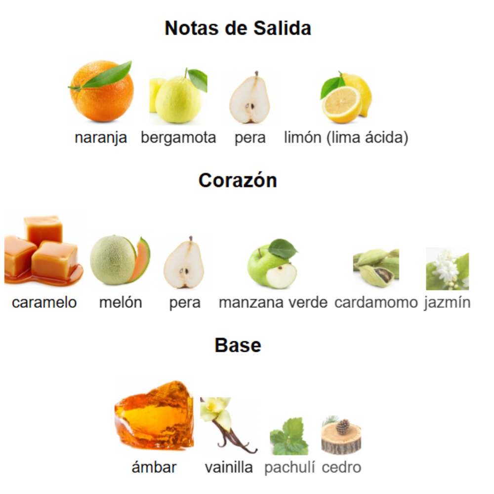 Corazón: melón, pera, jazmín, cardamomo, caramelo, manzana verde