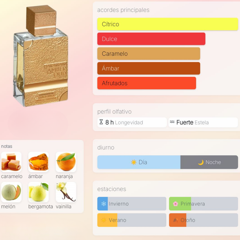 Una fragancia que celebra el lujo, la opulencia y la identidad de la ciudad de Dubái: Amber Oud Gold 999.9 Dubai Edition abre con una frescura chispeante de cítricos y fruta, se adentra en un corazón dulce-gourmand de melon, caramelo y manzana verde, y se asienta en un fondo rico y envolvente de ámbar, vainilla, pachulí y cedro.
