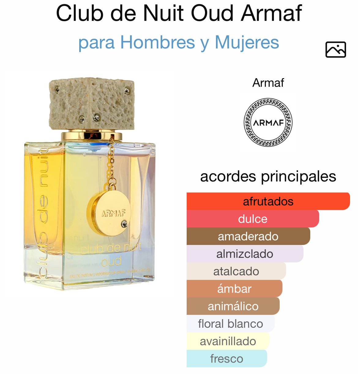 Club de Nuit Oud de Armaf es una fragancia de la familia olfativa para Hombres y Mujeres. Club de Nuit Oud se lanzó en 2023. La Nariz detrás de esta fragrancia es Christian Provenzano. Las Notas de Salida son durazno (melocotón), pera, maracuyá (fruta de la pasión), piña, ciruela y bergamota; las Notas de Corazón son madera de cachemira, jazmín, fresia y hojas de violeta; las Notas de Fondo son almizcle, Oud camboyano, vainilla y ámbar cristalino.