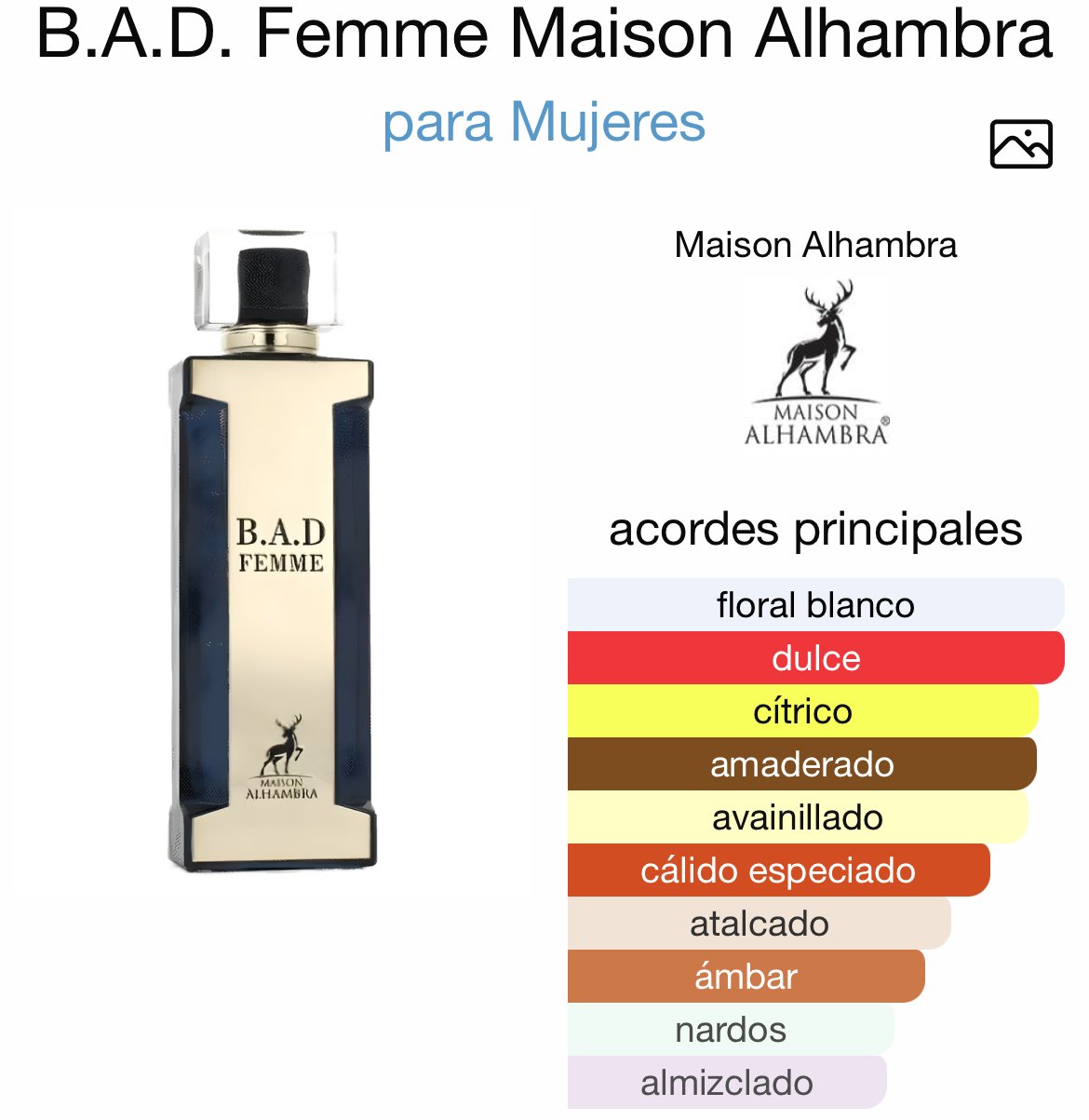 B.A.D. Femme es una fragancia intensa y seductora, creada para mujeres que aman los aromas dulces con carácter y un toque de sofisticación. Su salida vibrante combina bergamota, limón, café y almendra, abriendo con energía y un toque adictivo.