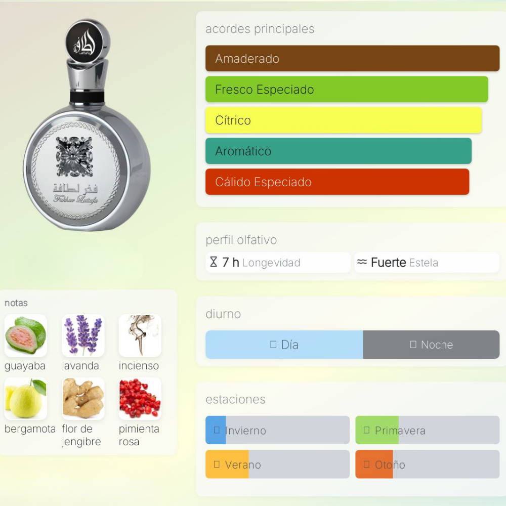 Una fragancia fresca y refinada que celebra la masculinidad moderna con elegancia sin esfuerzo. Fakhar Silver se abre con un golpe vibrante de bergamota y notas marinas, evoluciona hacia un corazón aromático con lavanda, salvia y geranio, y se asienta en un fondo amaderado con vetiver, pachulí y musgo de roble — dejando una estela equilibrada, limpia y sofisticada.