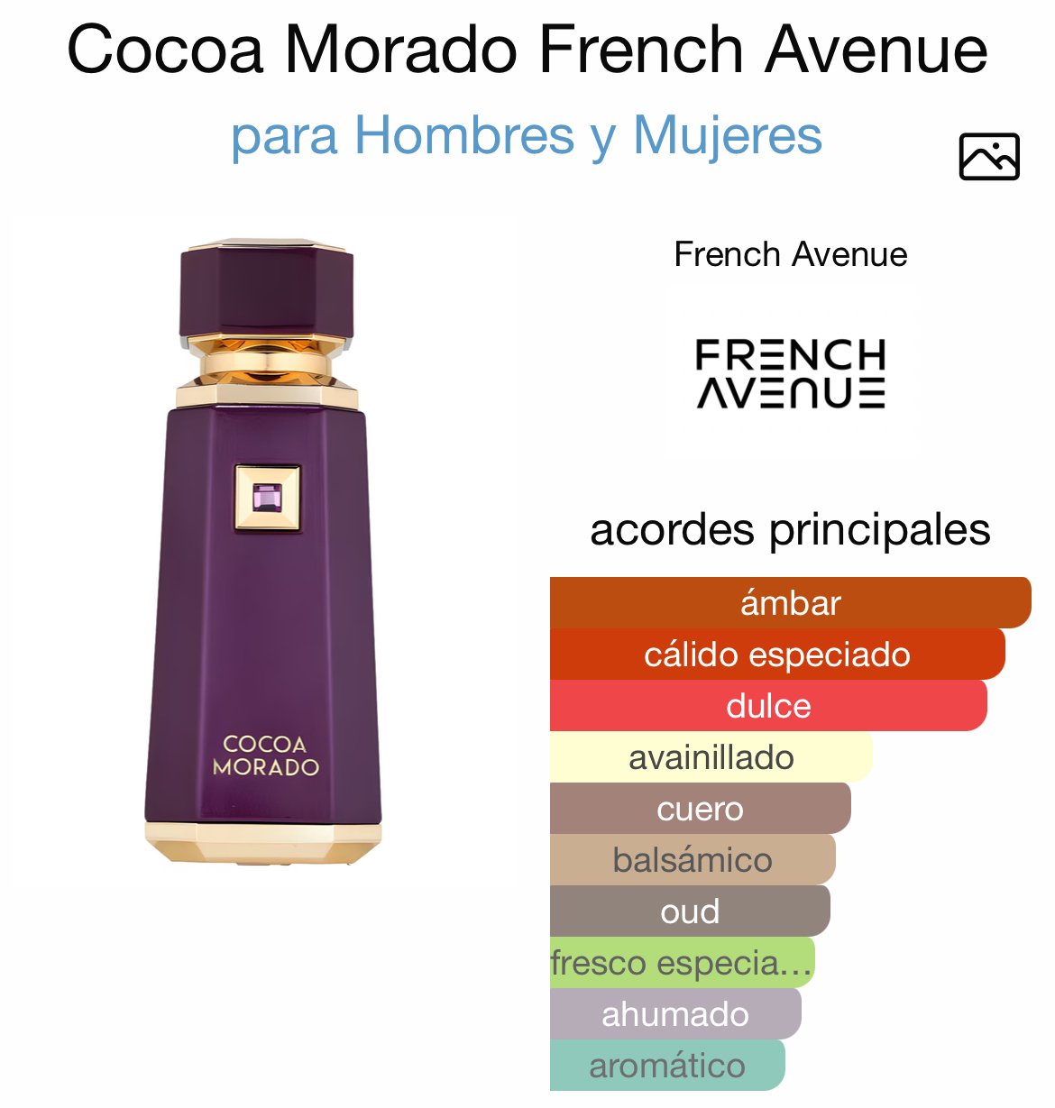 Cocoa Morado de French Avenue es una fragancia oriental amaderada unisex, lanzada en 2024 y creada por el perfumista Miroslav Petkov. Es un perfume opulento, cálido y lleno de carácter, diseñado para quienes buscan un aroma poderoso, envolvente y absolutamente inolvidable.