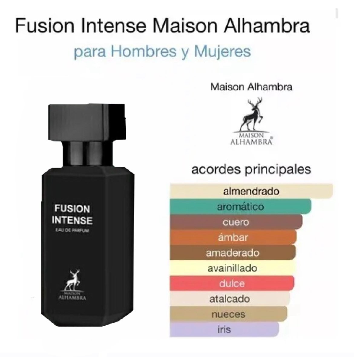 Fusion Intense es un Eau de Parfum cautivador, famoso por su mezcla rica y adictiva. Abre con una lavanda fresca y salvia aromática, que dan paso a un corazón envolvente donde destacan el cuero suave y la almendra cremosa. Su fondo es amaderado, ambarado y ligeramente dulce, gracias a la vainilla que aporta calidez y un encanto duradero.