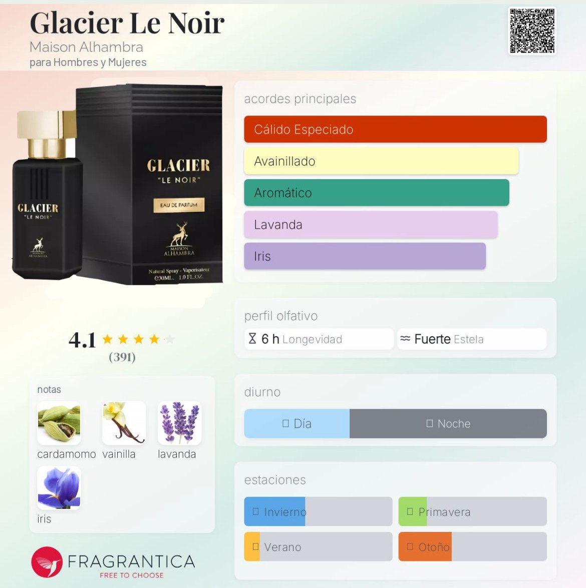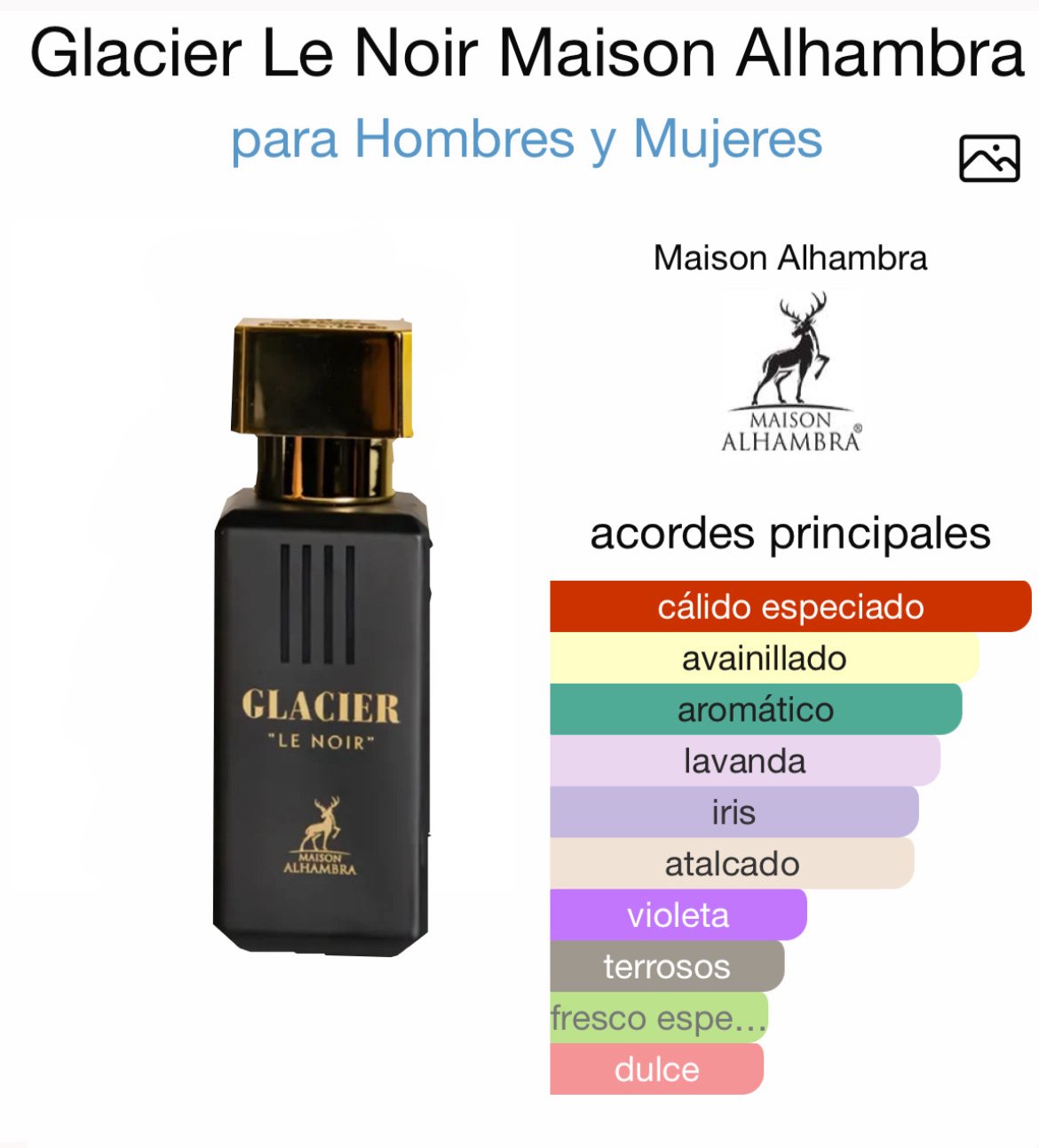 Glacier Le Noir de Maison Alhambra es una fragancia unisex, moderna y magnética, creada para quienes buscan dejar huella. Lanzada en 2024, llega con una estela elegante y envolvente que combina frescura, intensidad y un toque misterioso que la hace imposible de ignorar.