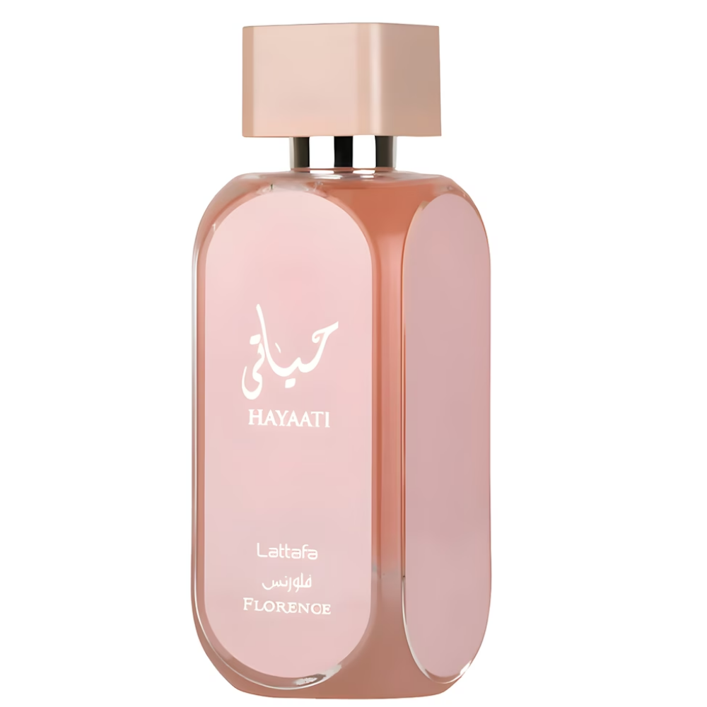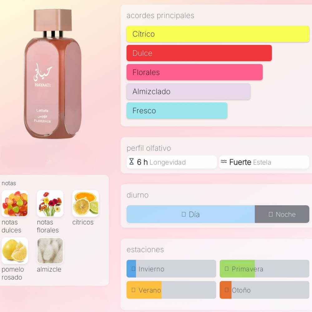 Una fragancia alegre, vibrante y con mucha presencia femenina: Hayaati Florence abre con un estallido frutal de lichí, pomelo y grosella roja que aporta frescura e impulso. Luego evoluciona hacia un corazón de rosa, durazno y cedro, aportando sofisticación y feminidad. Finalmente, el fondo de vainilla, praliné y ámbar genera una estela cálida, envolvente y apetecible.