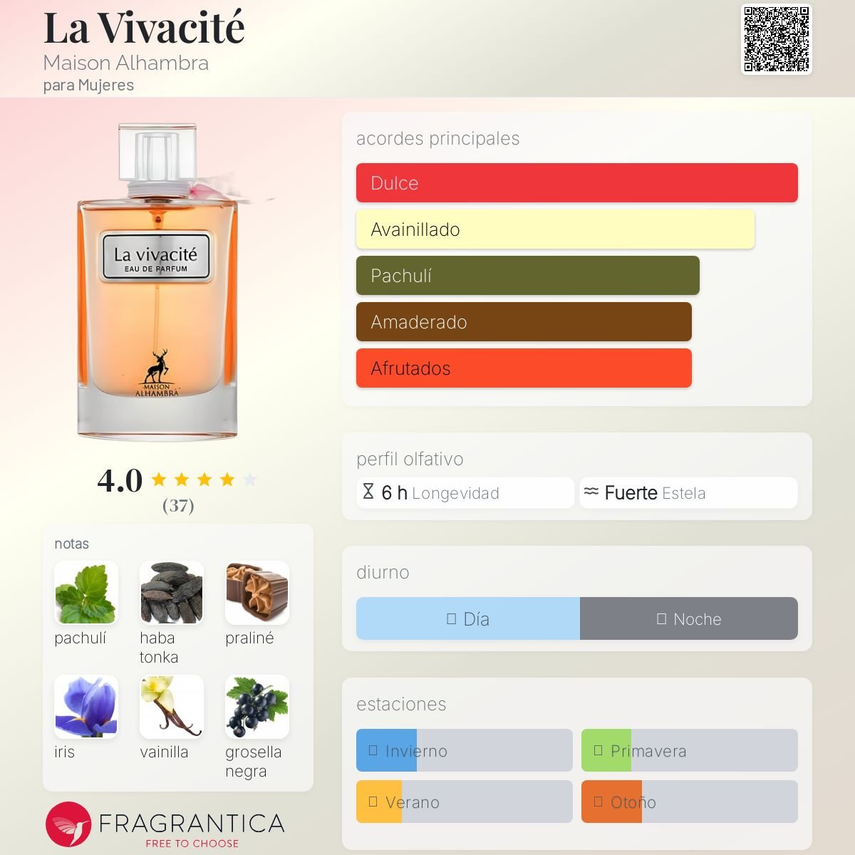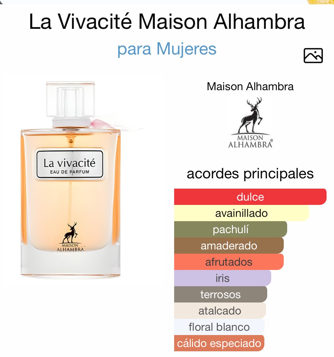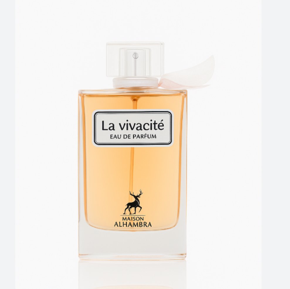 La Vivacité de Maison Alhambra es una fragancia femenina que brilla por su encanto radiante y su dulzura sofisticada. Lanzada en 2024, combina lo mejor del universo floral frutal en una estela moderna, femenina y adictiva.