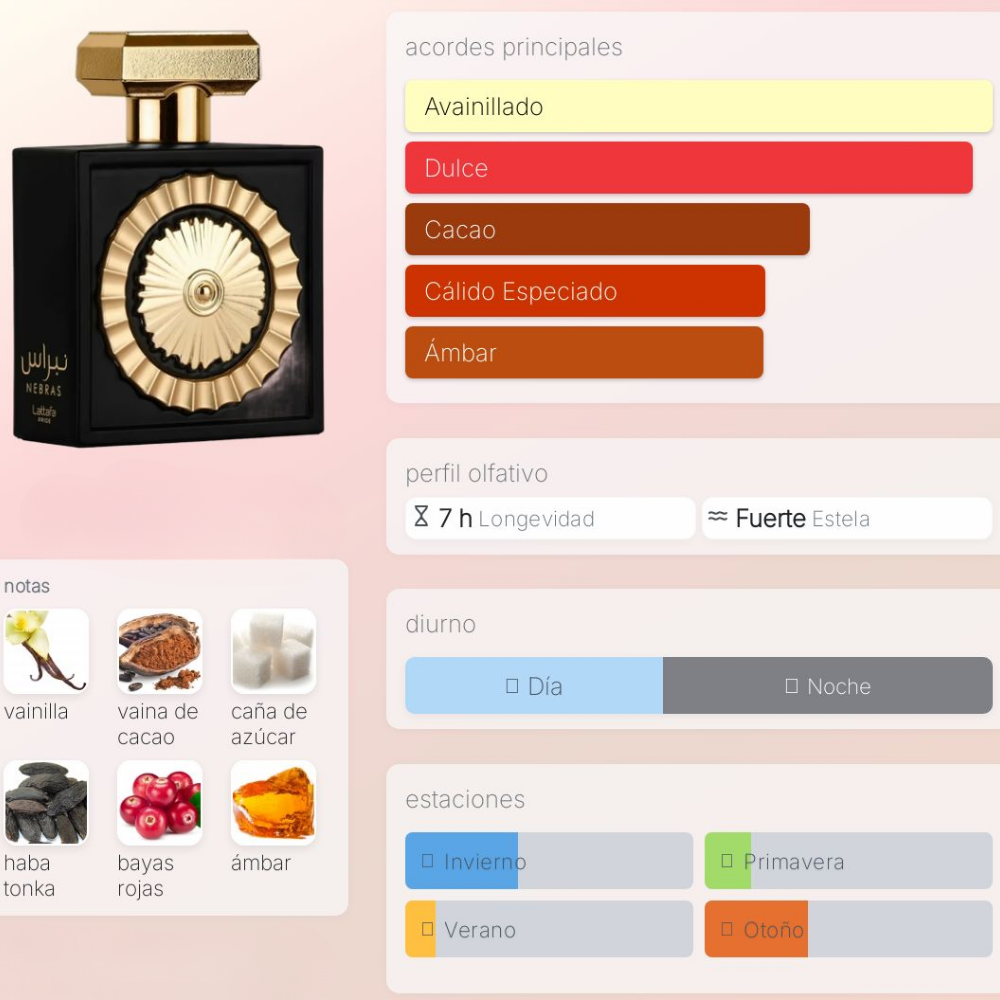 Una fragancia dulce, cremosa y envolvente que conquista desde el primer instante. Nebras combina acordes cálidos de vainilla, cacao y azúcar con un toque afrutado y ambarado, creando una esencia adictiva y sofisticada. Ideal para quienes aman los perfumes intensos, gourmand y con personalidad.