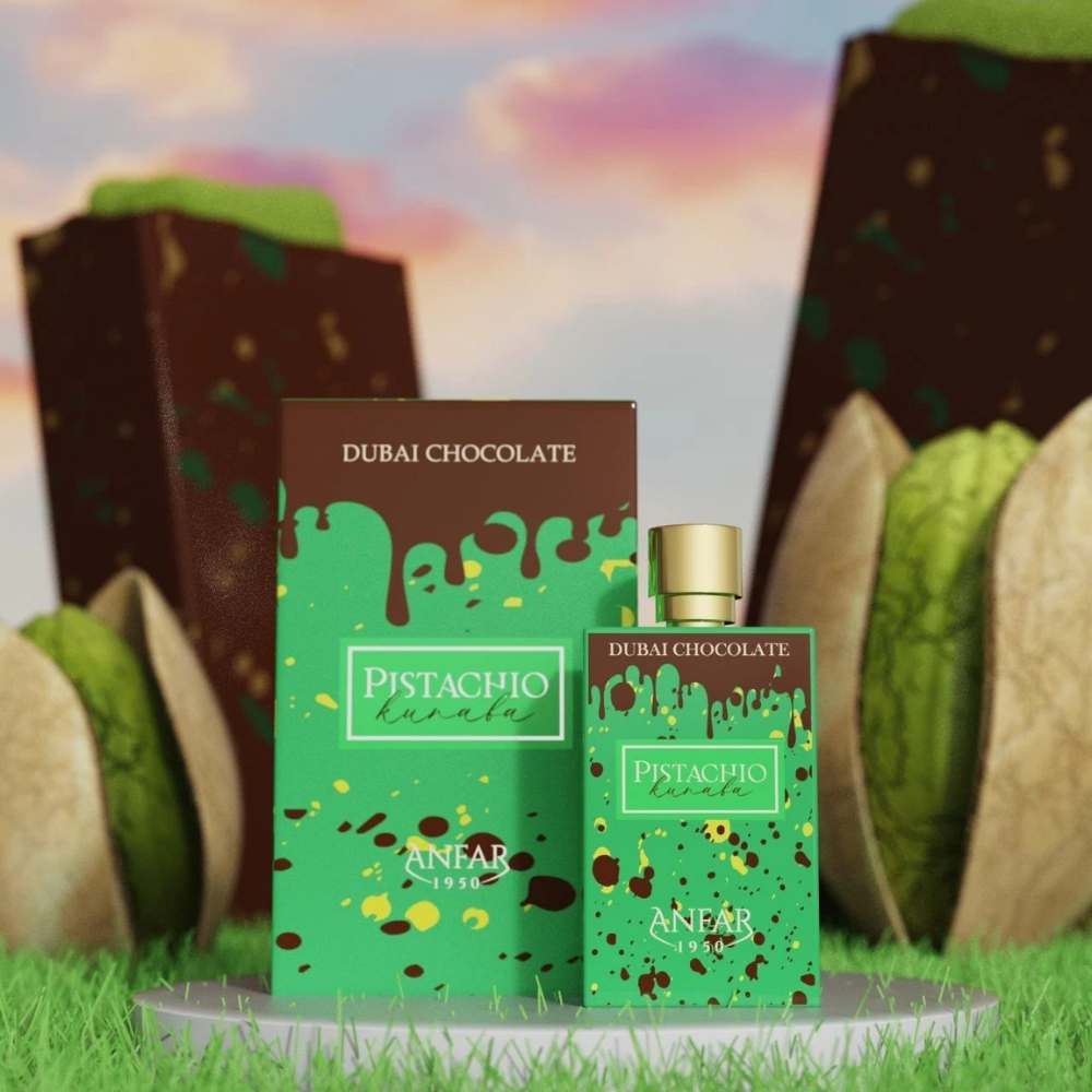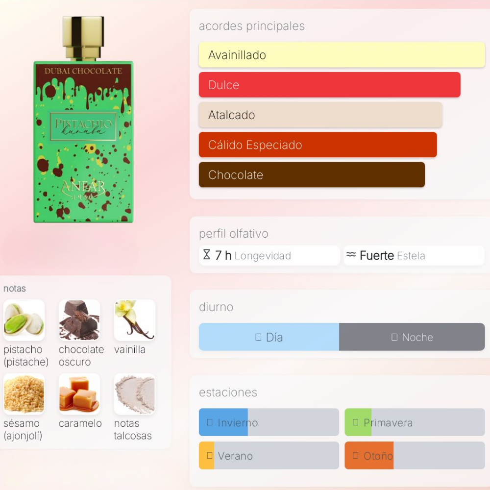 Una fragancia deliciosa y envolvente que captura la esencia del famoso postre árabe kunafa de pistacho en una experiencia olfativa sofisticada: Pistachio Kunafa abre con apertura de pistacho y caramelo, evoluciona hacia un corazón con tonka, cardamomo y tahini, y se asienta en un fondo rico de chocolate, vainilla, ámbar y matices polvosos.