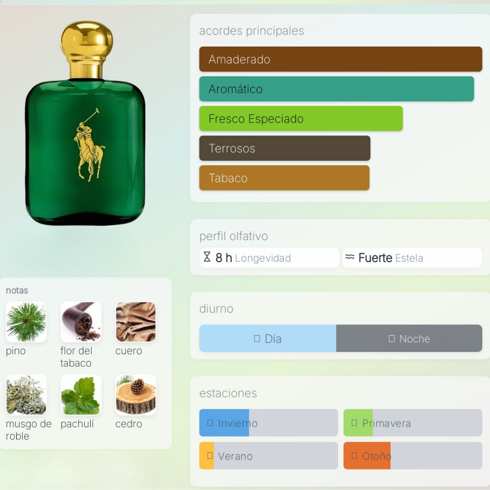 Un ícono de la perfumería masculina clásica. Polo Verde de Ralph Lauren es una fragancia intensa, elegante y sofisticada que representa el espíritu del hombre seguro, libre y con carácter. Se abre con una mezcla fresca de pino, albahaca y bergamota; en su corazón se destacan notas de cuero, tabaco y especias; y finaliza con un fondo profundo de musgo de roble, vetiver y pachulí que deja una estela distinguida y varonil.