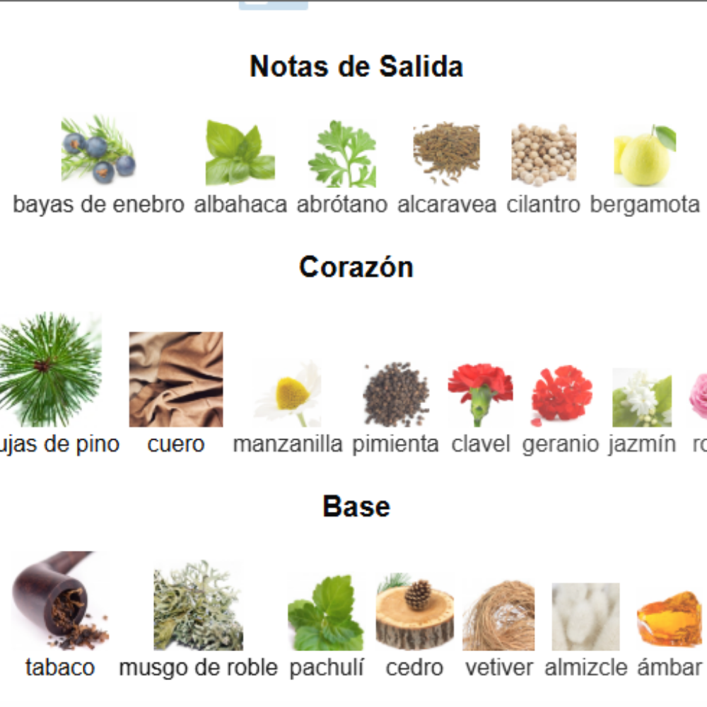 • Fondo: ámbar, pachulí, almizcle, musgo de roble y cedro.