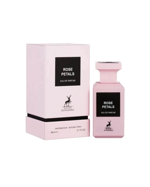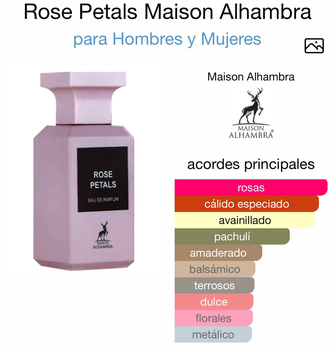 Rose Petals de Maison Alhambra es una fragancia de la familia olfativa para Hombres y Mujeres. Las Notas de Salida son rosa de mayo y rosa de Bulgaria (rosa Damascena de Bulgaria); las Notas de Corazón son rosa turca y azafrán; las Notas de Fondo son pachulí, vainilla y haba tonka.
