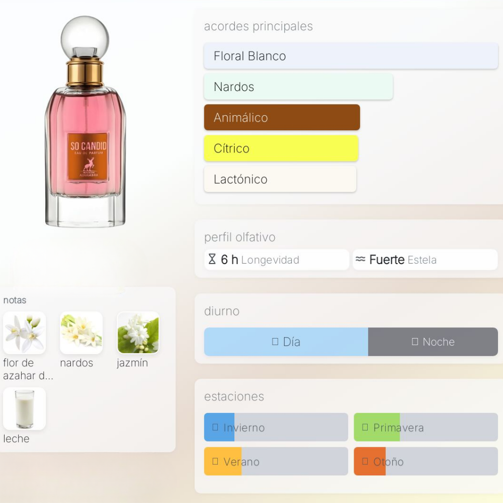 ✔️ Perfecta para el público que busca un perfume dulce-floral con carácter, elegante, versátil para primavera/verano o estaciones templadas.