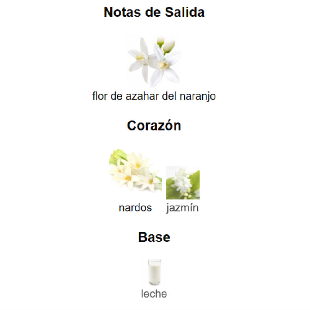 • Corazón: jazmín, flor de azahar del naranjo.