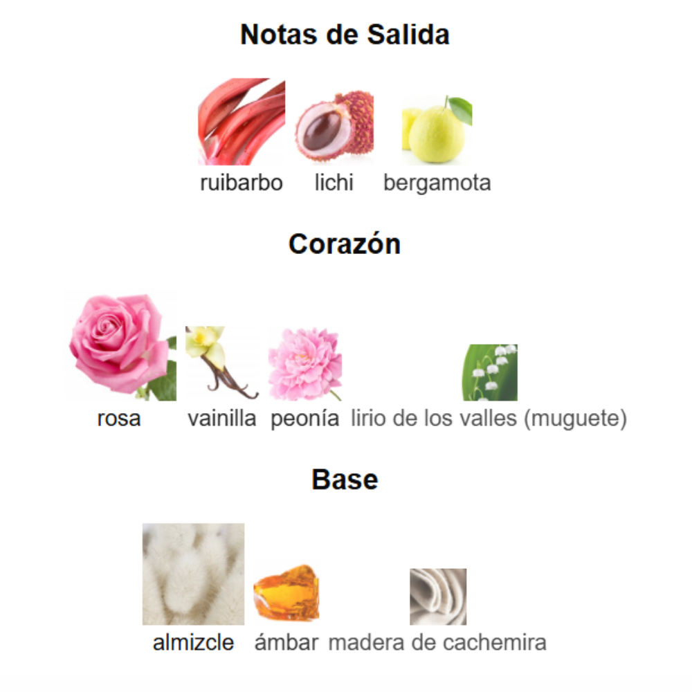 • Corazón: rosa, peonía, lirio de los valles (muguete) y vainilla