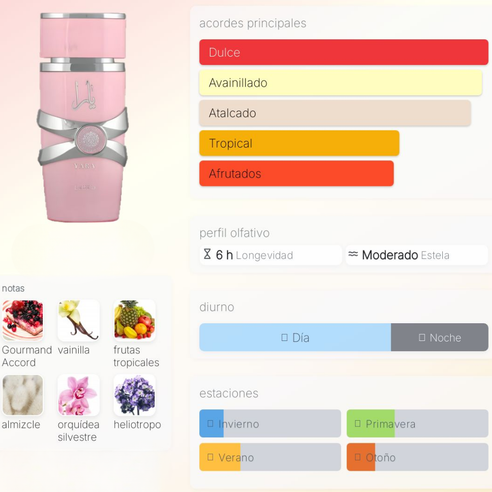 Una fragancia dulce y femenina que combina frescura frutal con una base elegante de vainilla y sándalo. Yara Rosa abre con un acorde ligero de tangerina y orquídea, evoluciona hacia un corazón con frutas tropicales y notas gourmand, y se asienta en un fondo de vainilla, sándalo y almizcle que deja una estela cálida y confortable.