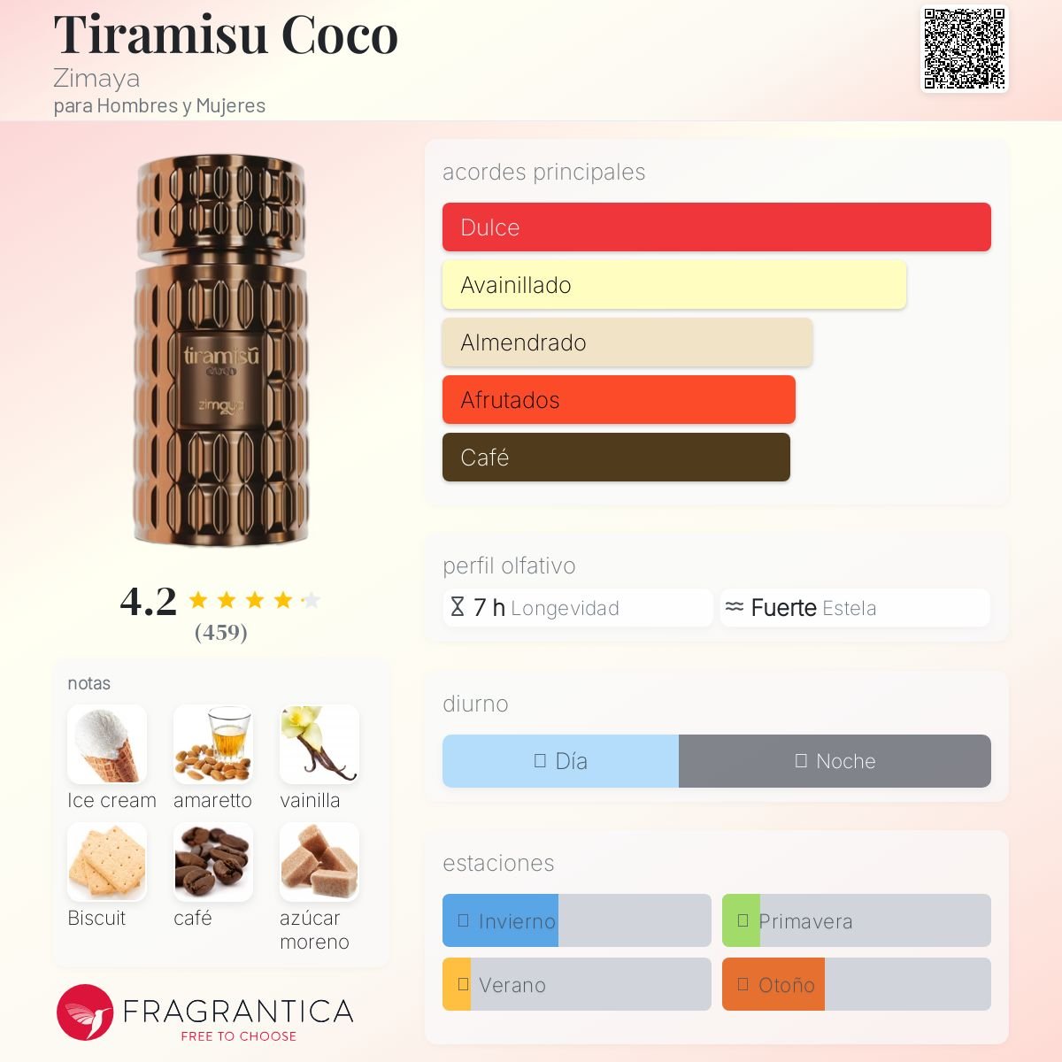 Abre con un toque irresistible de amaretto y café, se funde en un corazón goloso de helado, vainilla y bizcocho, y termina con un fondo cálido y envolvente de vainilla, azúcar moreno y ámbar.